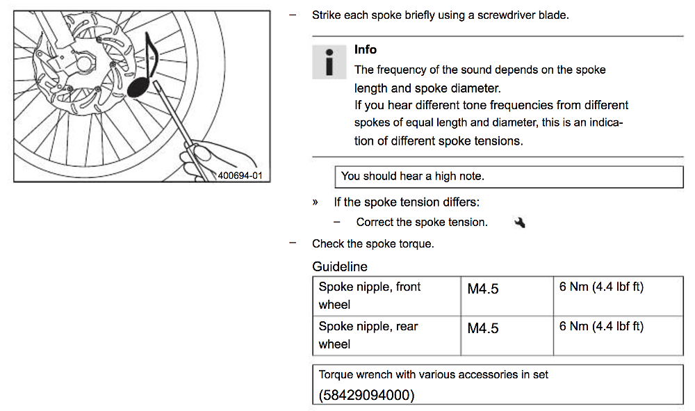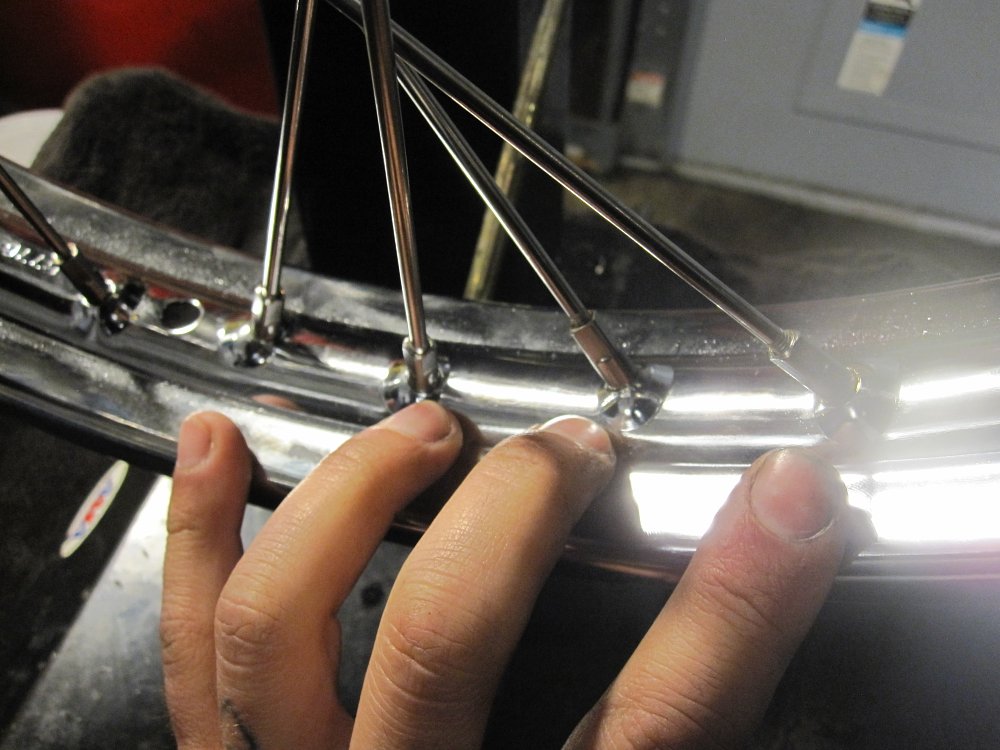Tensioning is basically getting the wheel back to that tight-as-a-drum factory spec. The trick is to tighten the nipples evenly all the way around, constantly checking for wobble and hop on every lap around the wheel, using the valve stem hole as a reference. This can certainly be tedious but this is where you are building strength into your wheel. I generally tighten the nipples just a quarter turn at a time per lap around the wheel until it’s tight. Your service manual may list the torque setting your nipples should be at, which of course requires a spoke torque wrench. This is also the time you should be checking the offset.
