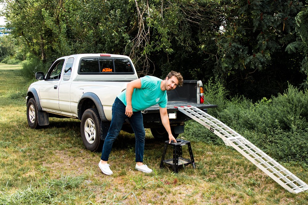 I’ve recommended (strongly!) in the past pulling your gate if loading a motorcycle. I stand by that advice still: The cables don’t like all that weight, and a motorcycle concentrates a lot of weight on the center, the weakest part of the gate. A dirt bike, though, is different. Dang near any pickup truck can support the weight of a man or a dirt bike. (Try not to make it support both, if you can.) Toss your ramp on there. I’ll recommend strapping the ramp to the truck, but I’ll be honest: I literally never do this, and I don't know any off-road riders who do. Yes, the ramp might shoot out from under the bike. No, it’s never happened to me. I live on the edge. If you're worried, strap it to the truck.