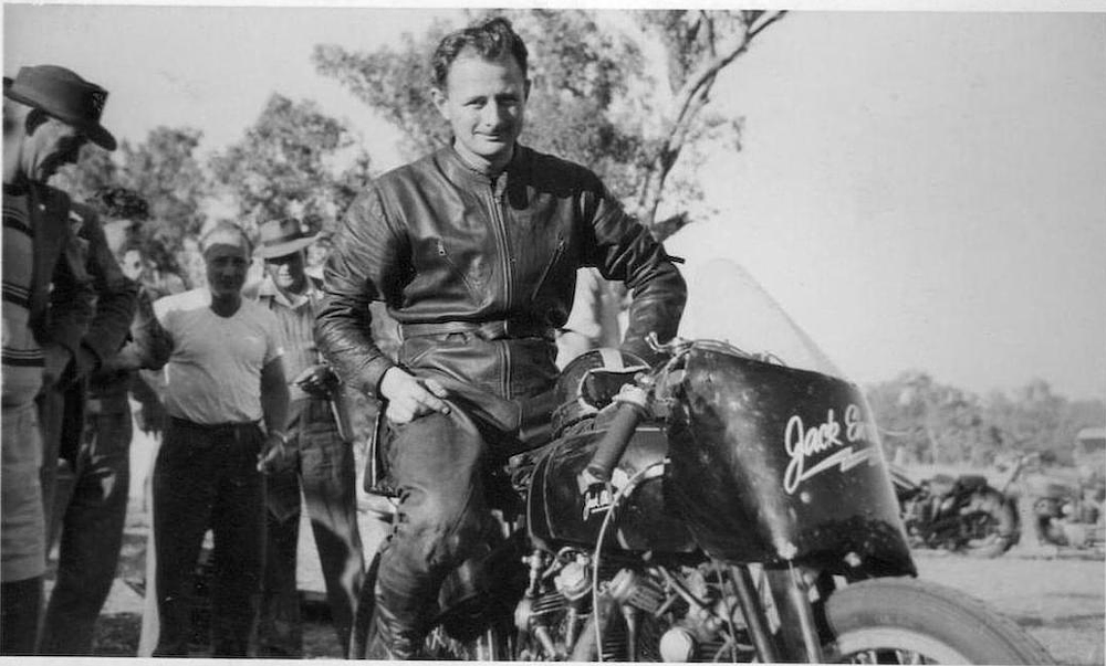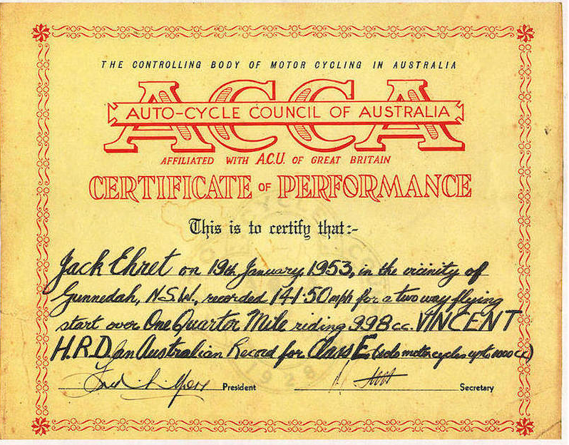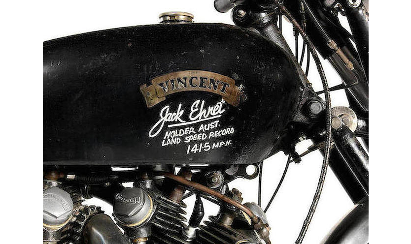 Isle of Man racer Tony McAlpine imported Black Lightning No. 7305 to Australia in 1952. It was briefly owned by another racer before Ehret bought it thirdhand. In 1953, Ehret put his Black Lightning in the history books by posting an average speed of 141.5 mph during land speed record attempts on a closed public road (the previous record was held by a similar Black Lightning).