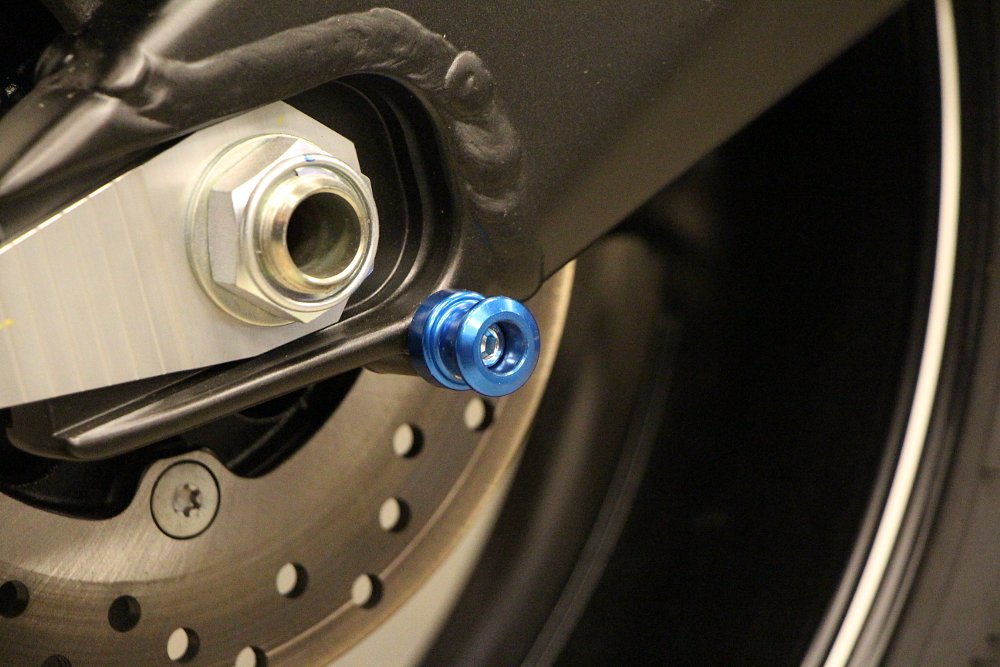 You might not even know what a spool is. (I believe our British readers refer to them as "bobbins.") Spools are little doodads that thread into your swingarm to make it possible to use a rear stand (again, "paddock stand" to you Limeys), as shown in the photo up top.