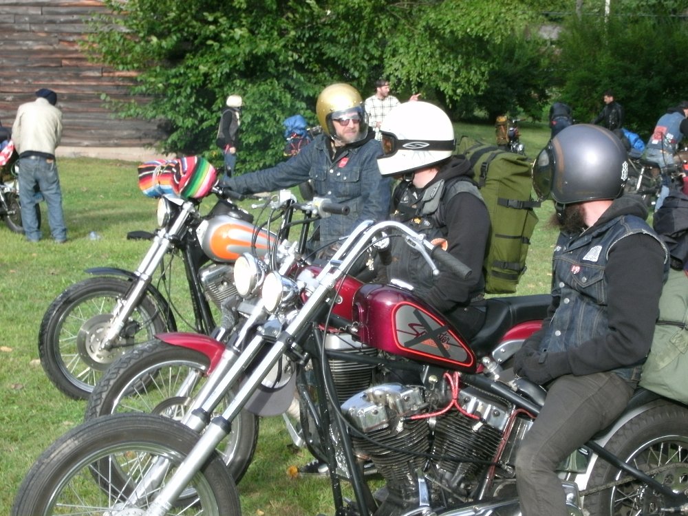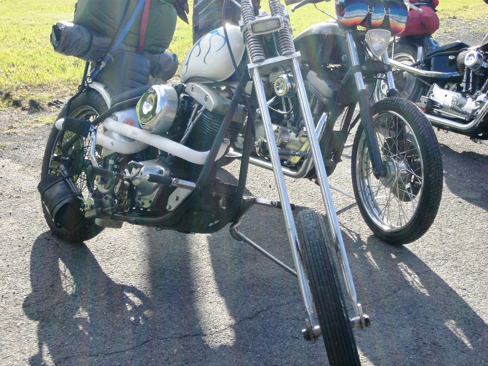 Let’s start with the chopper. I’m no motorcycle prodigy, but I think one could fairly define a chopper as a bike with a frame that has been cut to give greater rake angle. Often, choppers have other things cut, as well — horn mounts and sidecar loops get lopped off. Toolbox mount? Yeah, cut that. Once the frame has been cut, there are some other characteristics that choppers share. Most chops are hardtails, but swingarm varieties exist. Front wheels are skinny, and the front ends are long. Floorboards are not present; choppers have footpegs. Excess crap is nowhere to be found, and you’ll rarely find a fatbob tank on a chopper. Remember the Captain America bike? Archetypal chopper.