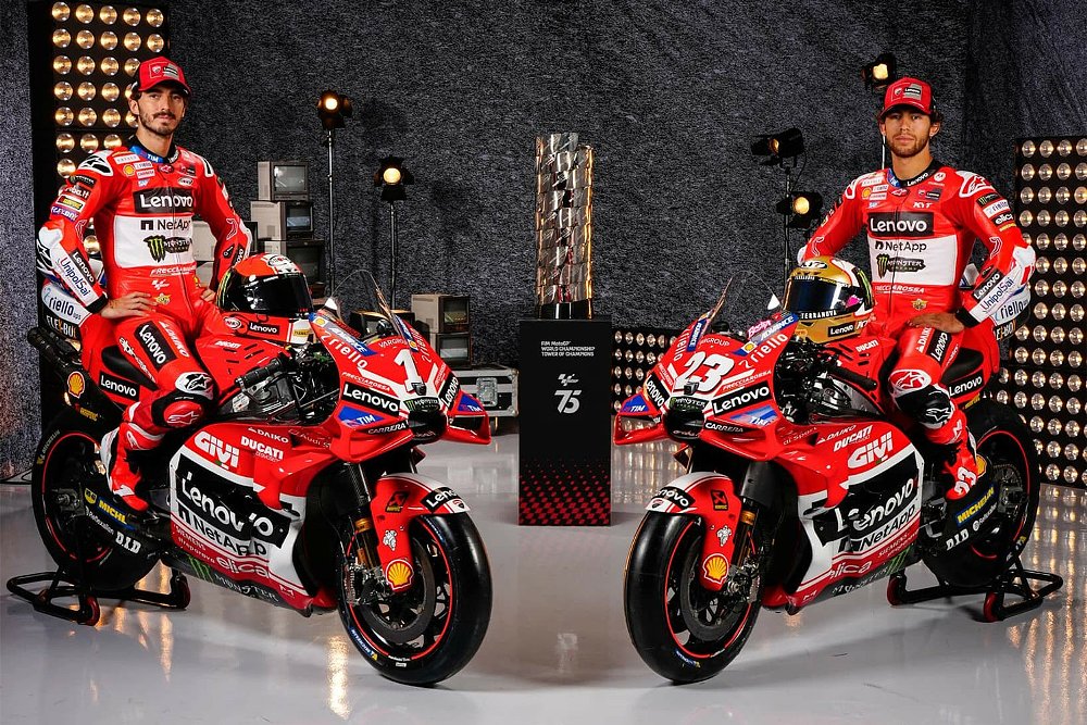 Ducati entered MotoGP’s Premier Class in 2003. The brand’s British GP livery is an ode to that debut. Notice the Marlboro branding didn’t come along with it. MotoGP photo.