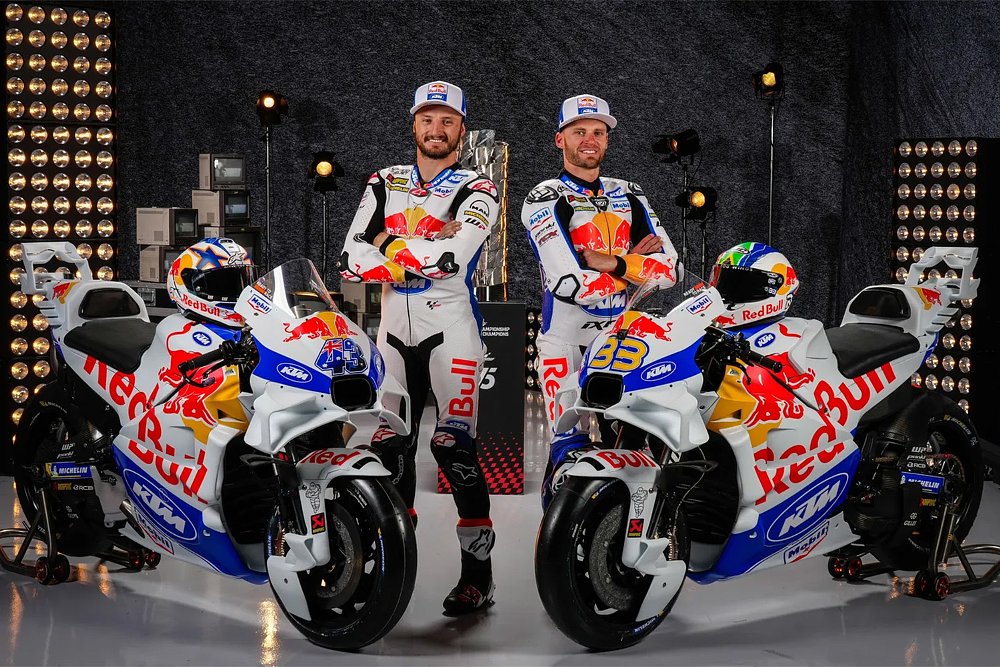 The white and blue paint scheme favored by Red Bull KTM is an ode to Team Orange’s 1989 LC4 race machine. MotoGP photo.