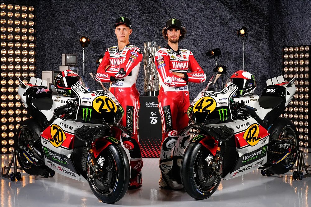 Yamaha takes its YZR-M1 back to the 1970s. The design honors the Iwata factory’s first premier class title captured by Giacomo Agostini in 1975. MotoGP photo.