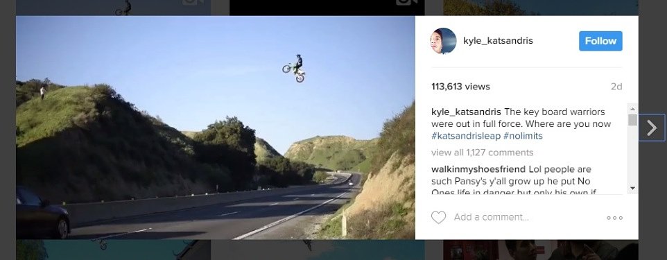 Some people are demanding that's what should happen to Kyle Katsandris while others are defending him after he posted a video on Instagram of jumping his motocross bike over Highway 60 near Moreno Valley, California. Morning traffic flows underneath as he flies across the four-lane road.