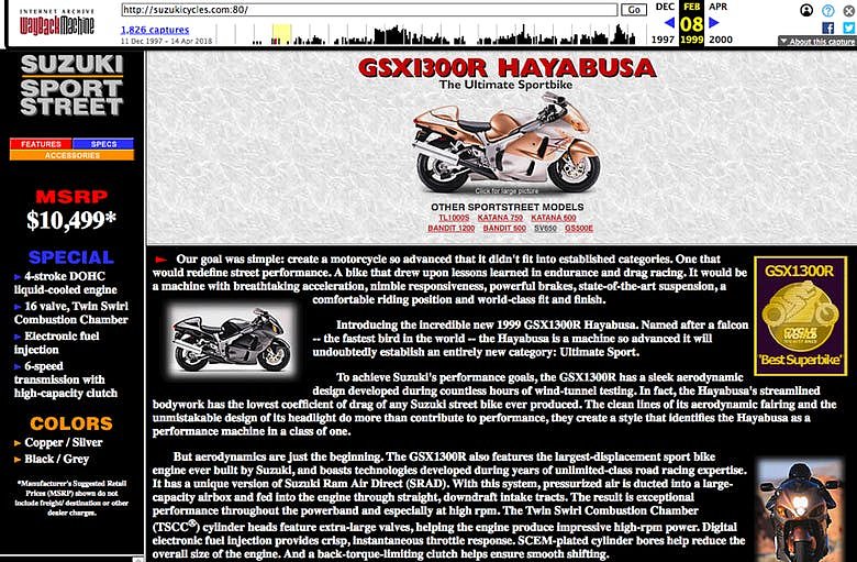The Wayback Machine is the best free time machine out there. Set the clock for the late 1990s and visit motorcycling on the World Wide Web 20 years ago. Flash Player download not included.