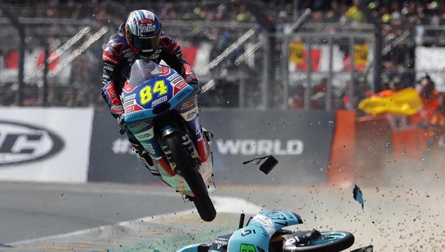 “Miracle” save: Jakub Kornfeil jumps a crashed opponent in Moto3 race