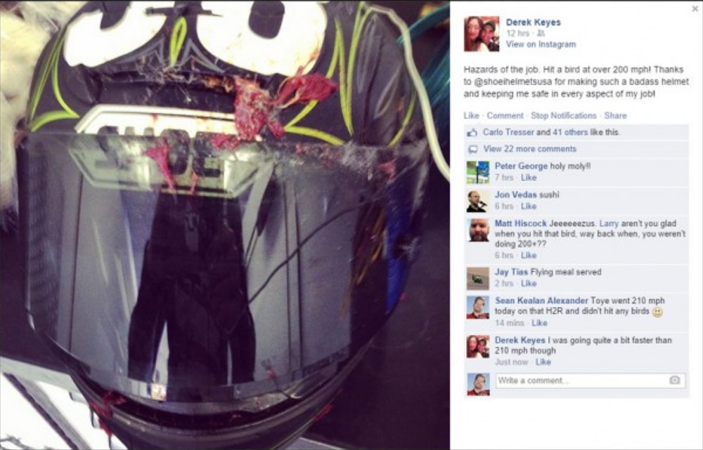 VisorDown also had some screenshots of some very interesting Instagram posts from test riders Jeremy Toye and Derek Keyes, implying that the bike does "quite a bit faster than 210 mph." That poor bird.