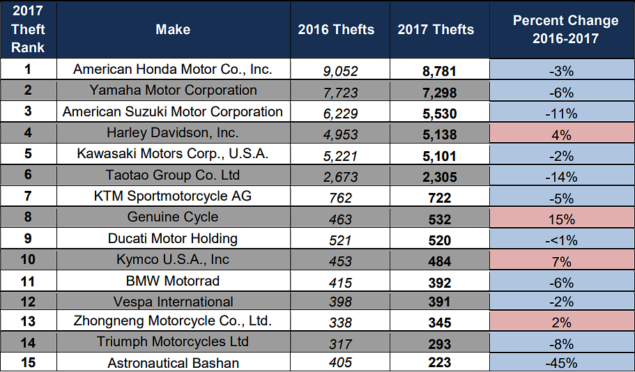 As manufacturers go, Honda has the dubious honor of being the most stolen marque in the United States, with 8,781 disappeared. Yamaha’s close behind at 7,298, then Suzuki (5,530), with Harley and Kawasaki roughly tied in the low 5,000s.