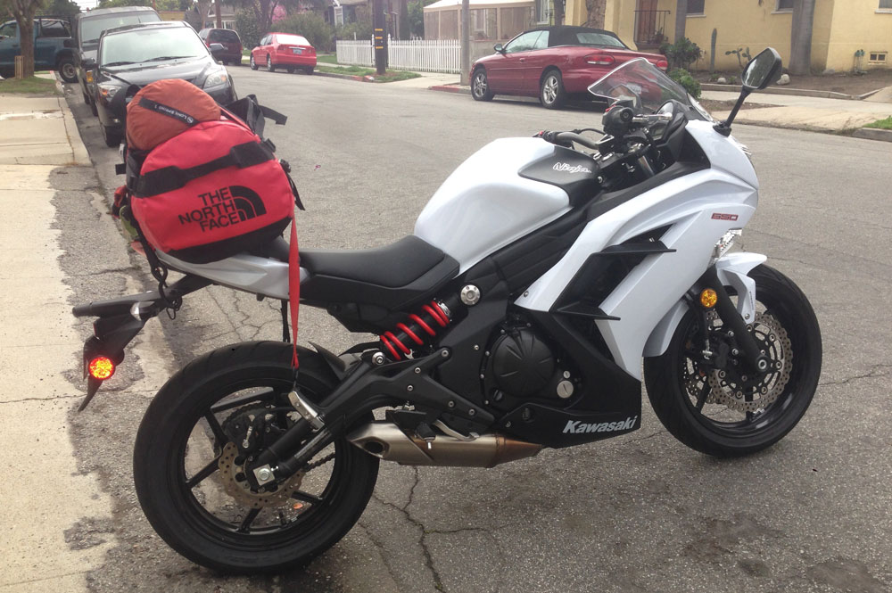 I pull up in front of Scott's house on a 2013 Kawasaki Ninja 650 packed to the gills with camping gear as he emerges from his pickup, tool roll in hand.