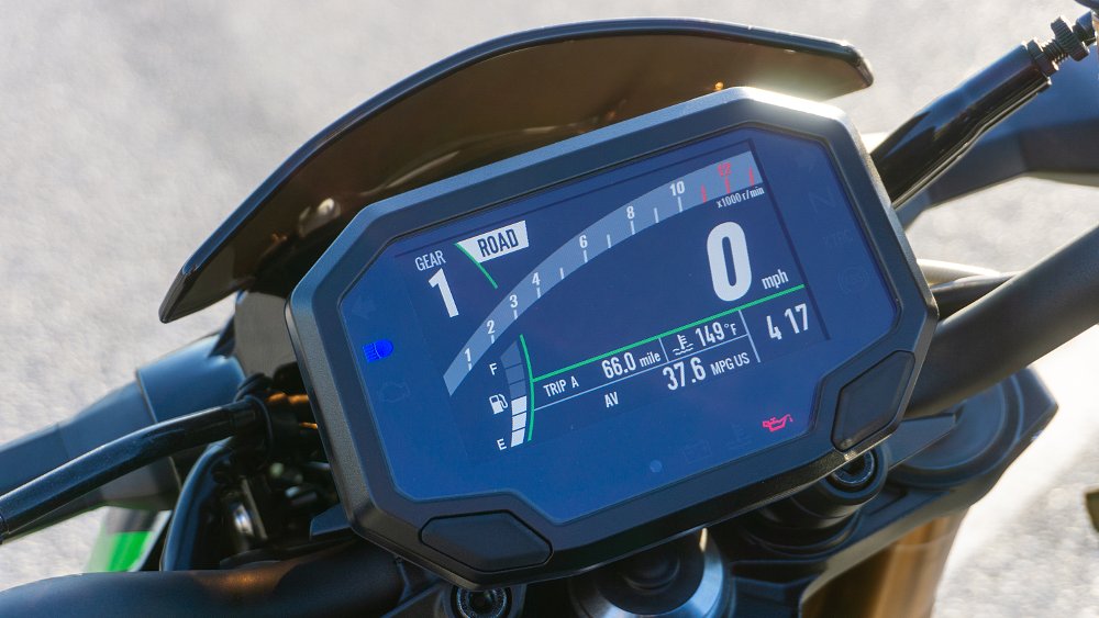 I have no qualms with the Z900’s electronics package. Albeit basic, rider aids like traction control and ABS enhance safety while four ride modes (Road, Sport, Rain, and Rider) adapt to different conditions. It may not live up to the IMU-based tech leading the category, but each feature performs as expected. Yet another example of good, not great. While it’s hard to fault the electronics, navigating the system is another story.