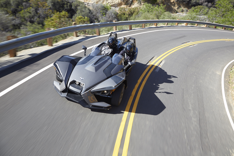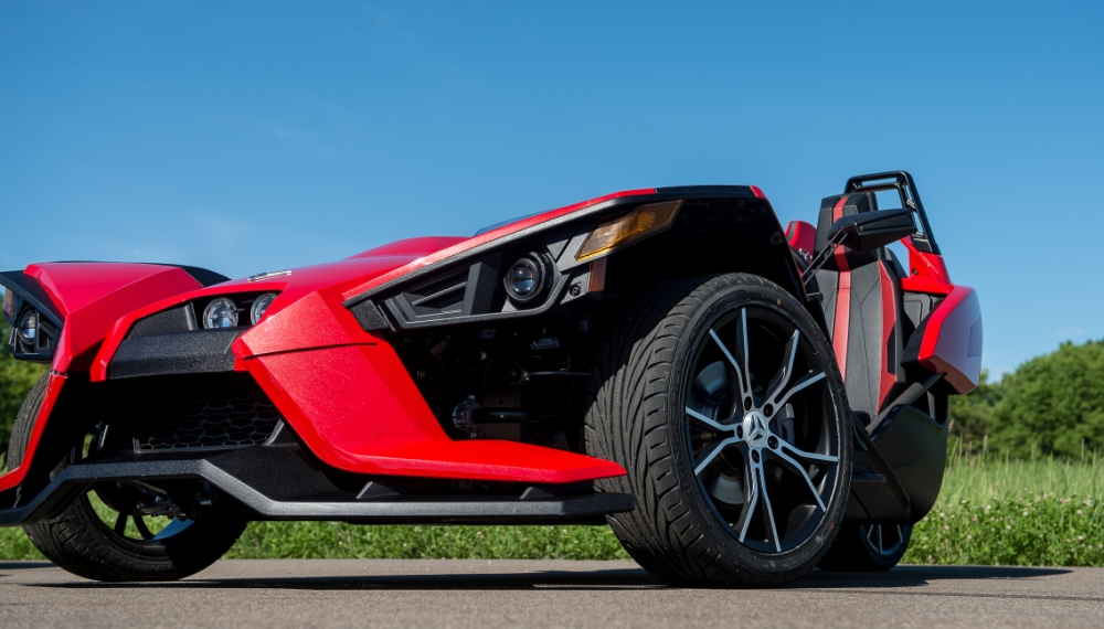 The Slingshot is a three-wheeled roadster with an open-air cockpit. It has a similar setup to a Can Am Spyder, but instead of sitting on it, you sit in it (which should help keep you from being flung from it while cornering). Along with the steering wheel, instead of a handlebar, the side-by-side seating is the most fundamental difference between the Spyder and the Slingshot. The differences definitely make the Slingshot look more car-like than the Spyder.