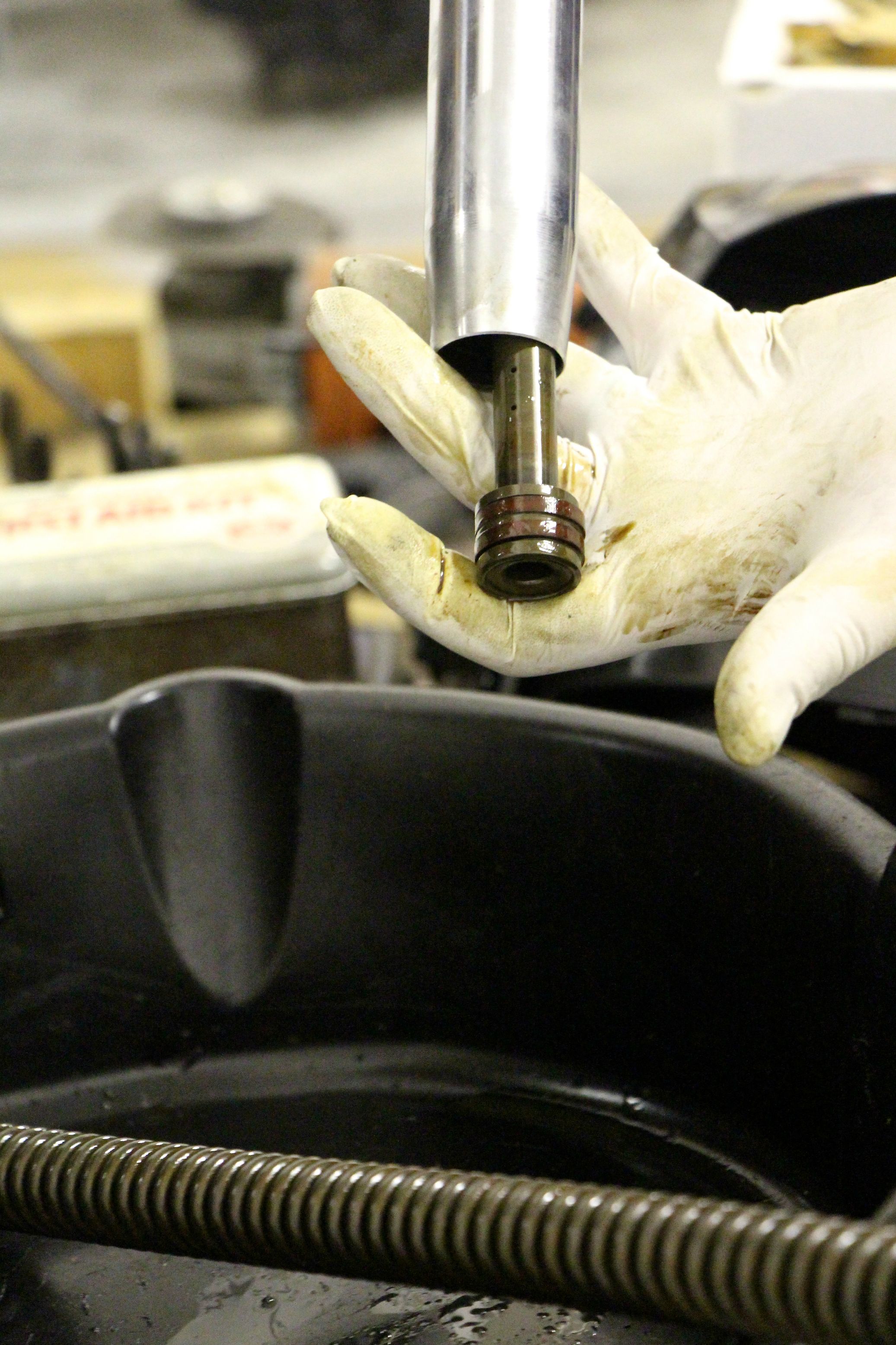 Next I remove the bolt that retains the damper. The reason we screwed that fork cap back in is to get this little guy out of there. The spring tension often puts enough resistance against the damper that it won't spin too much. Sometimes you have to fashion some sort of a long, skinny tool to get down into the fork leg to hold the damper rod from spinning. Usually, I am able to spin them off with an impact gun if they don't loosen by hand. Remember that drain pan? After you get that bolt out of there, it will puke up some oil.