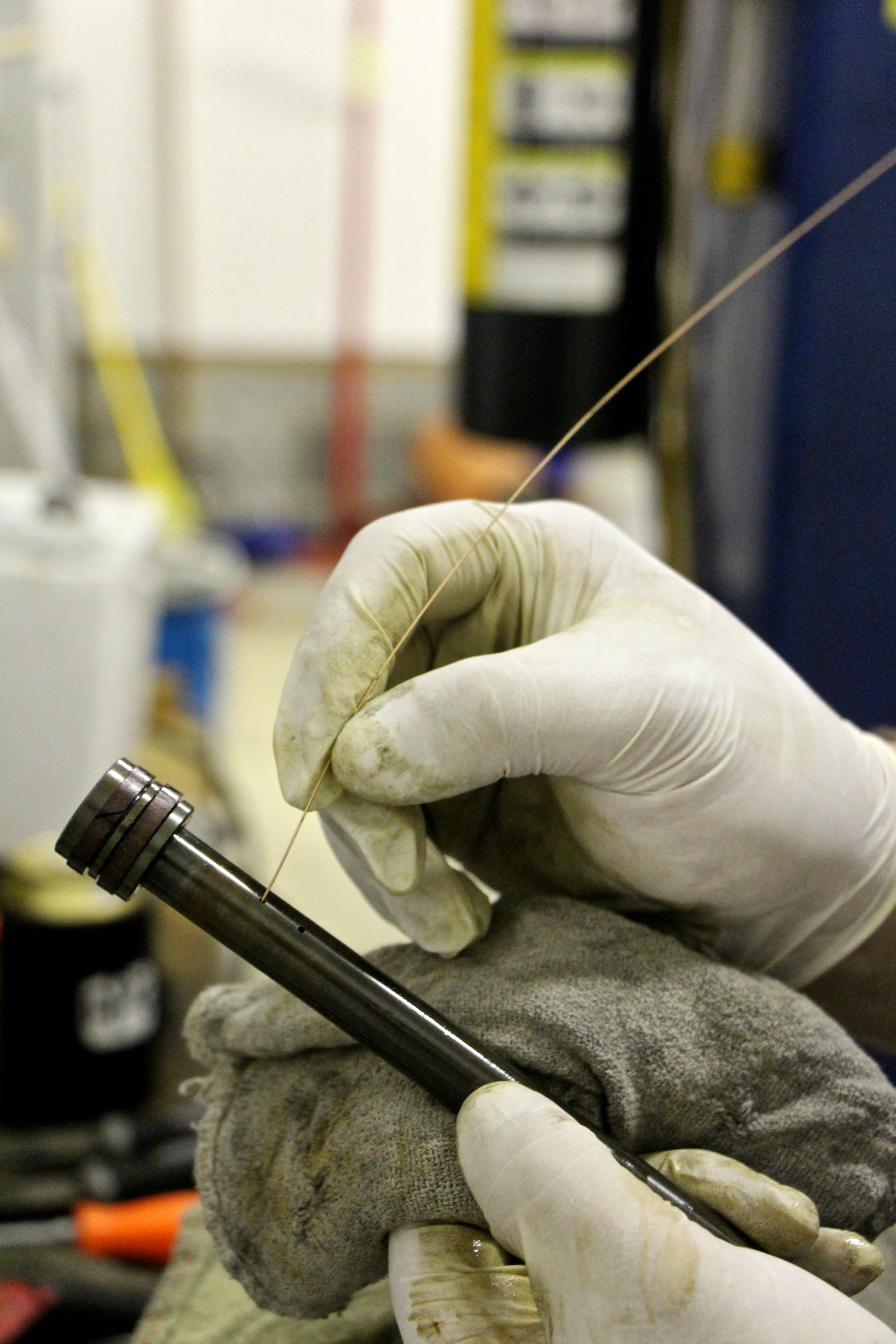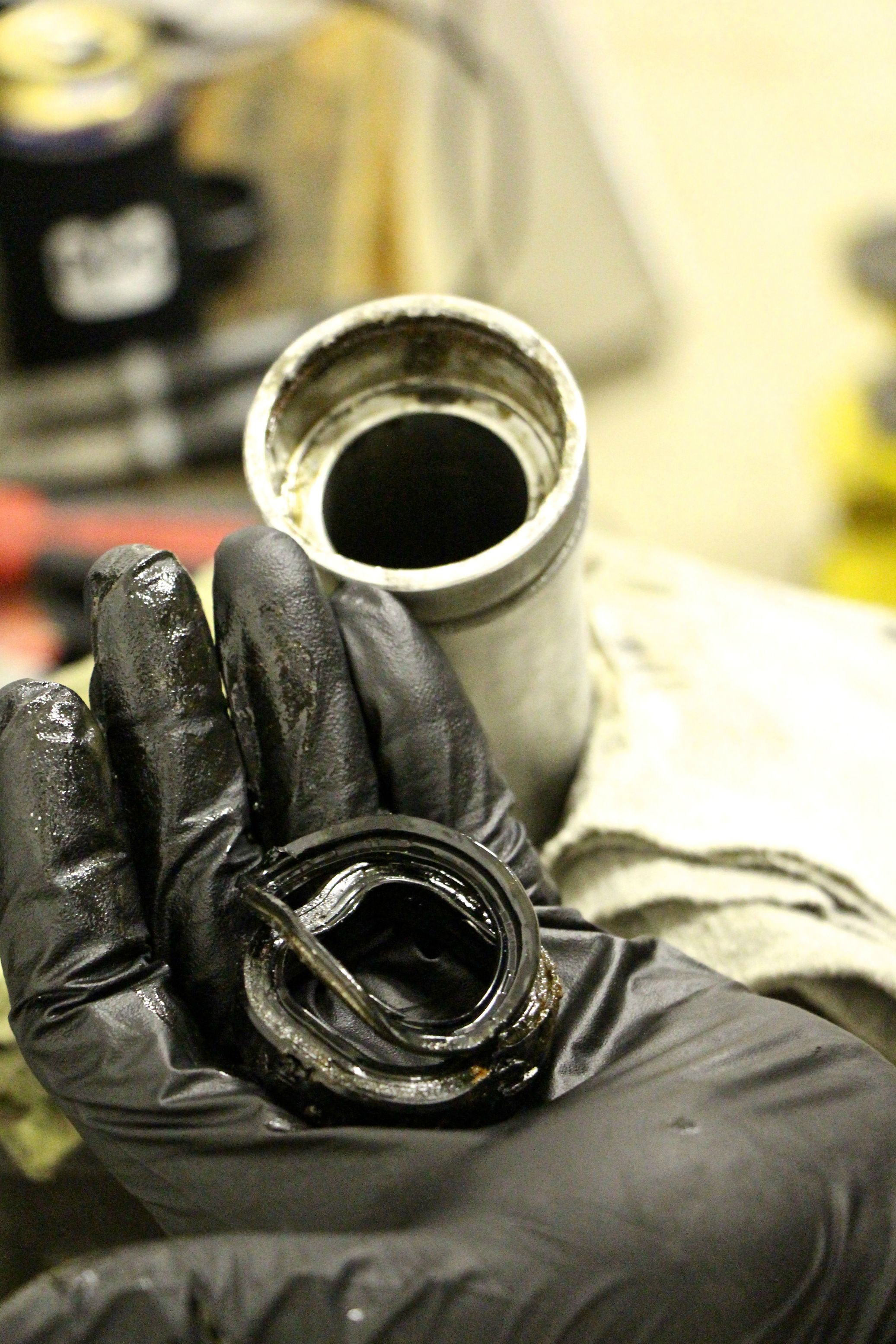 Clean the damper tubes. I use kerosene. Guitar strings are wonderful for cleaning out the orifices. Be sure to get all the sludge out. These forks work pretty dang well when they are clean and sealed correctly. If you like awful front-end action, just leave everything dirty. Put fresh O-rings on the damper tube. Again, this is not part of resealing the fork to hold fluid, but heck, we're already in here, right? In this application, I prefer OEM damper O-rings to aftermarket offerings, so I often put good ones back into play. Sometimes, inspection trumps replacement.