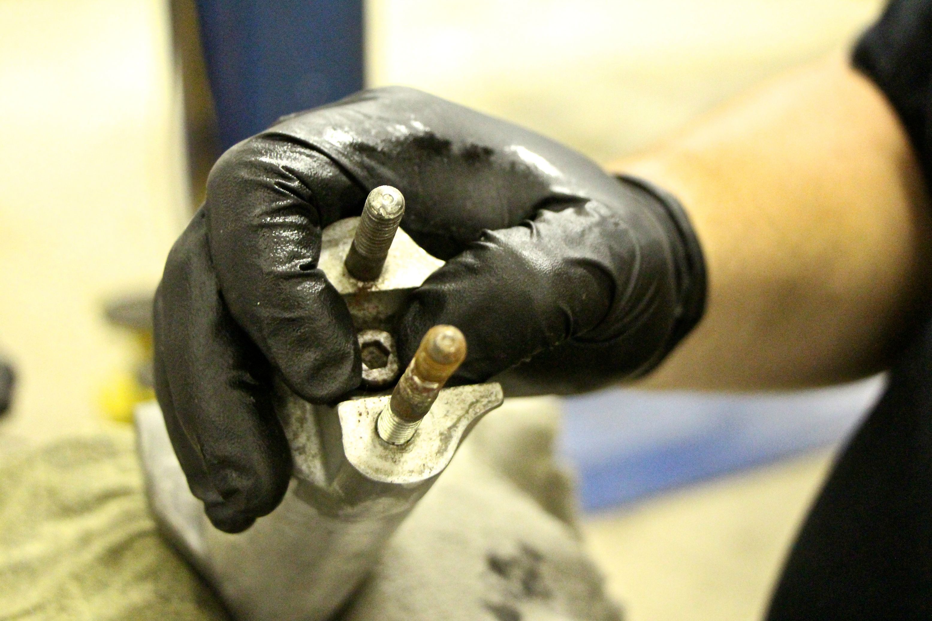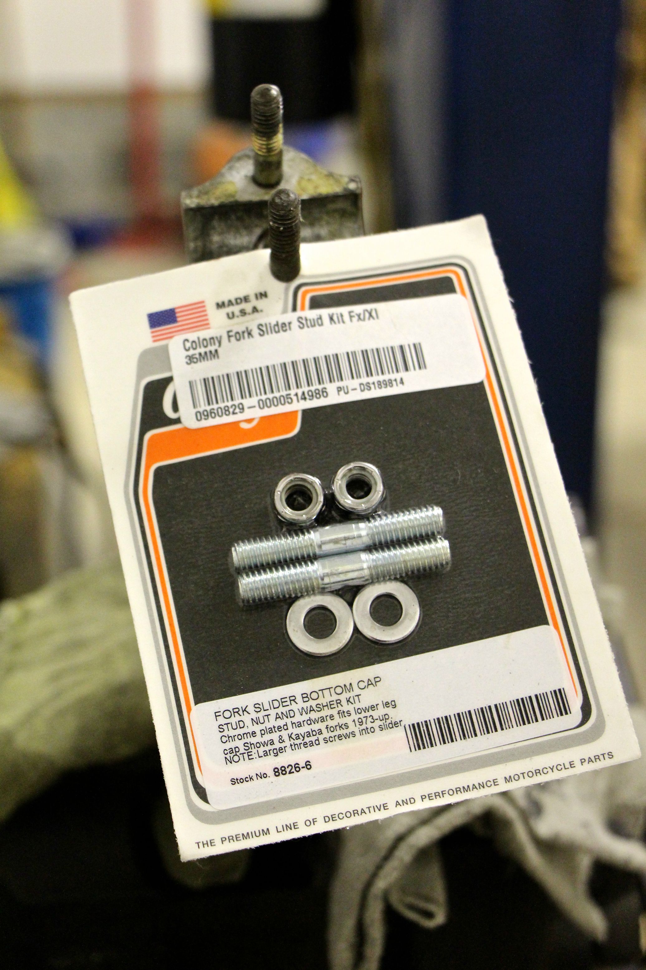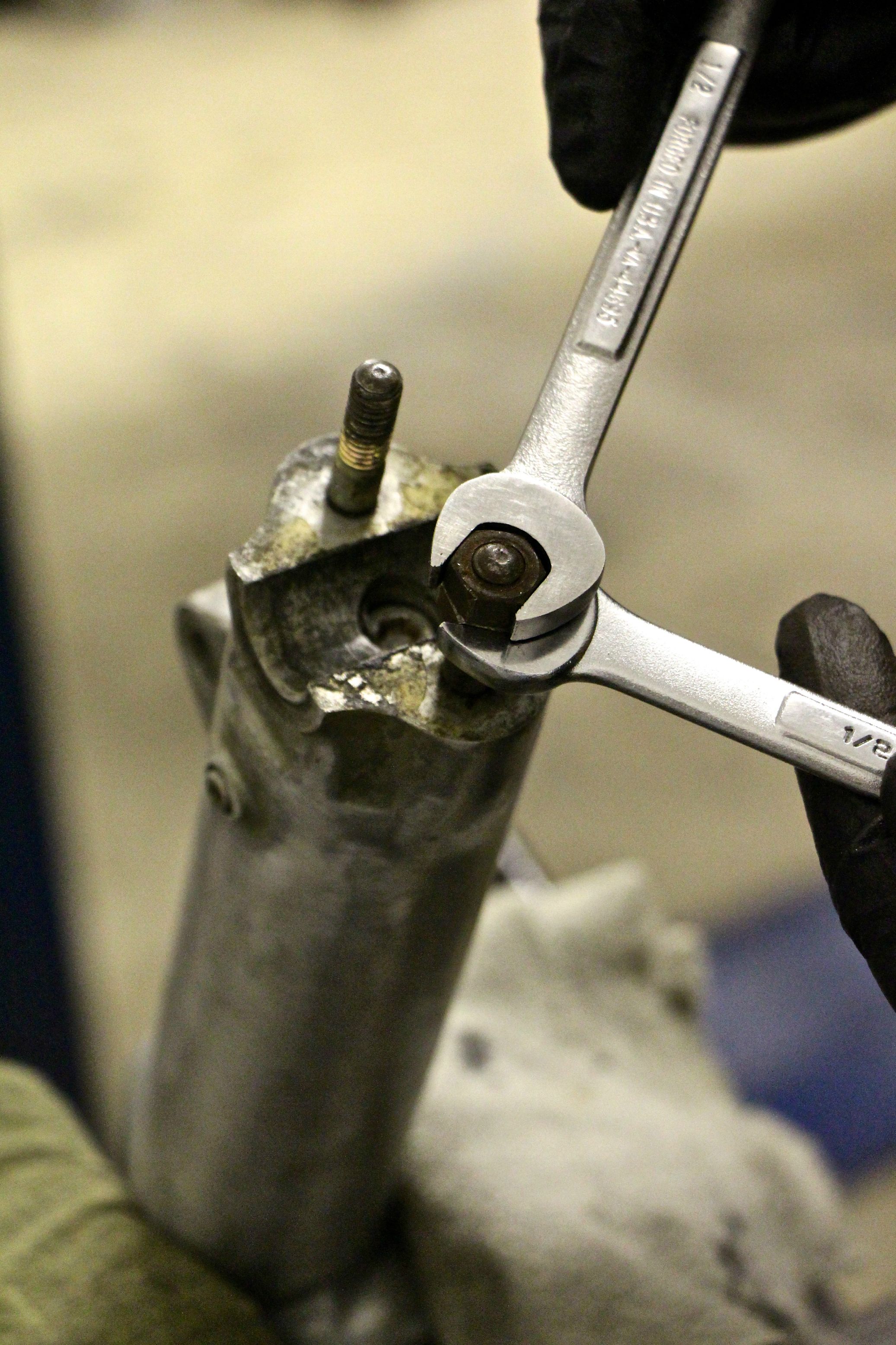 Clamp the fork lower horizontally in your vise, and put a drain pan under it. Examine your axle cap studs. If they look knackered, clean them up with a die or replace them. This is obviously not part of the resealing process, but heck, they’re on the bench, so now's the time to check, right?