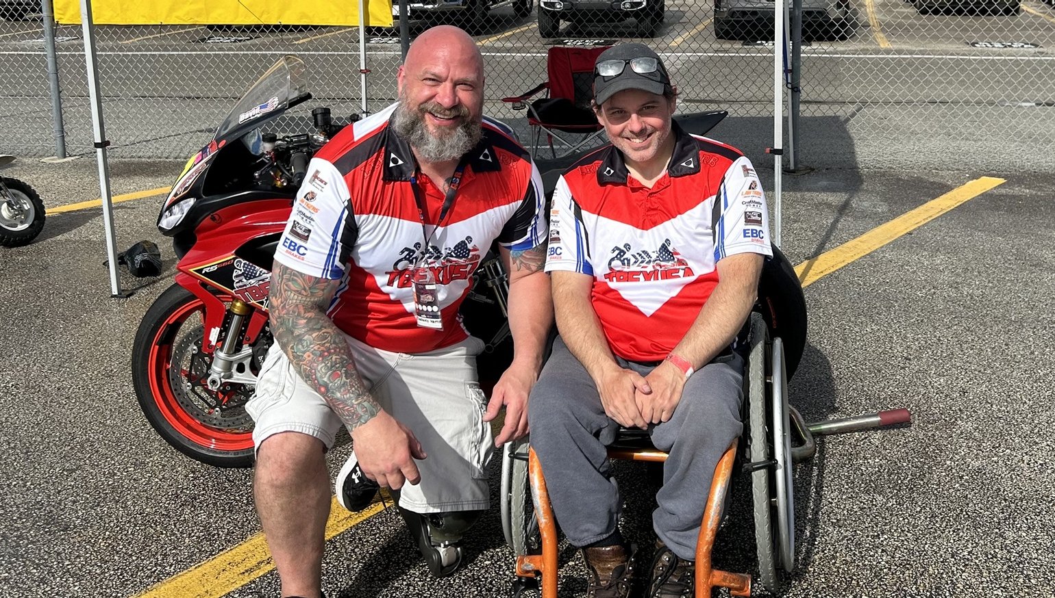 "I had a bad wreck on the road, got tangled up in a guardrail, and broke my back," he says. His daughter found The Bike Experience USA — now partnered with Ride Again — on Facebook. He met Mike Petrosini of TBEXUSA and several paraplegic racers at a MotoAmerica race in New Jersey. "I was hooked."