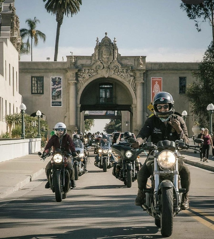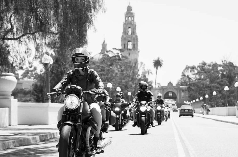A pack of motorcycles rumbles through downtown San Diego, long hair and silk scarves waving in the wind. Turquoise feathers flutter on their handlebars and the riders sport a collection of brown leather jackets, tall boots, and even aviator goggles.