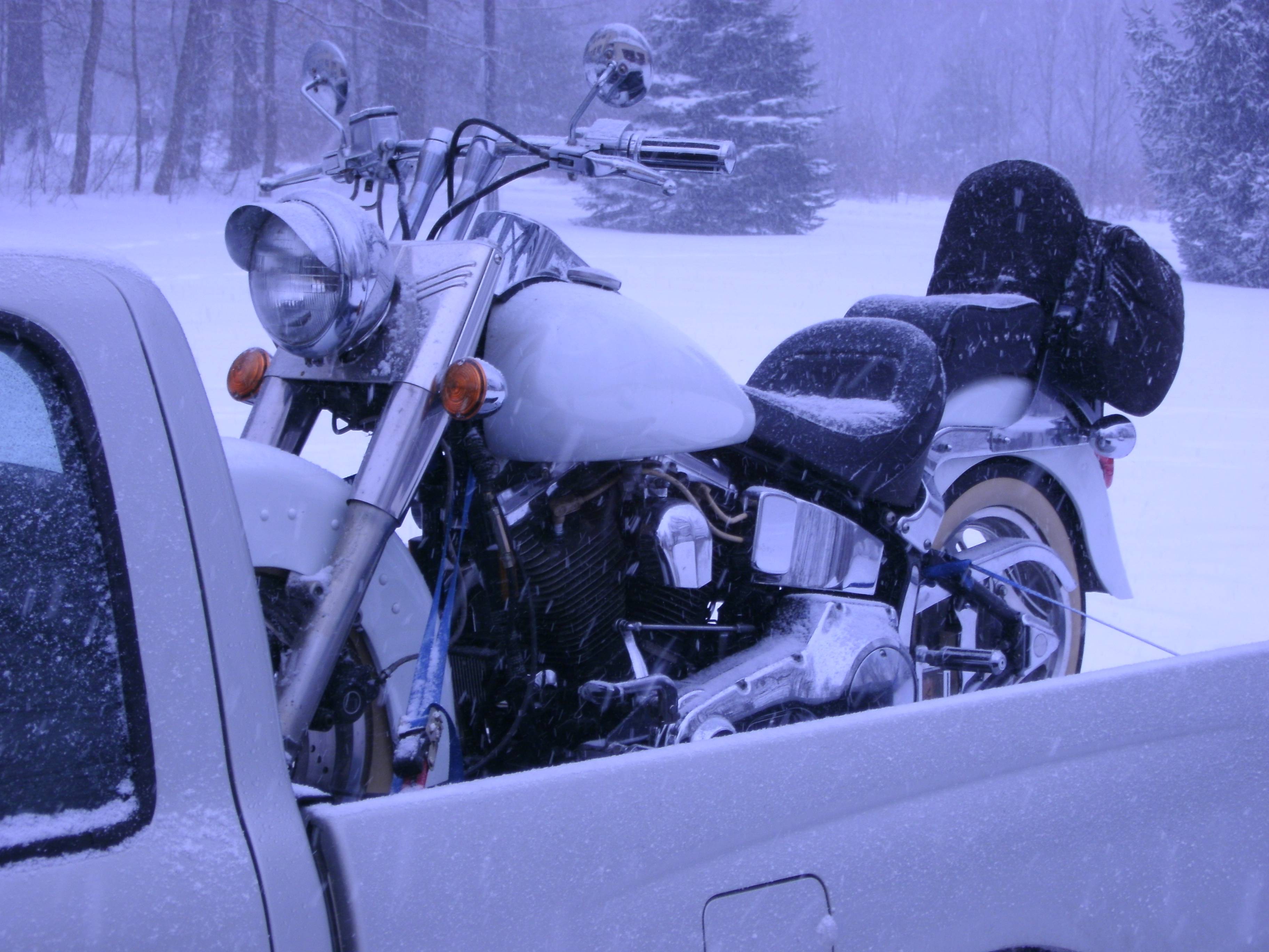 At this point it was snowing really heavily. Chopper people do weird chopper things and tooling around in the snow with a big bike in the bed of a two-wheel-drive pickup was my weird thing for the day. A trip to Dunkin’ Donuts at this point yielded a delicious breakfast, a happy wife, a few more inches of snow to travel through, and a better story. Safety be damned.