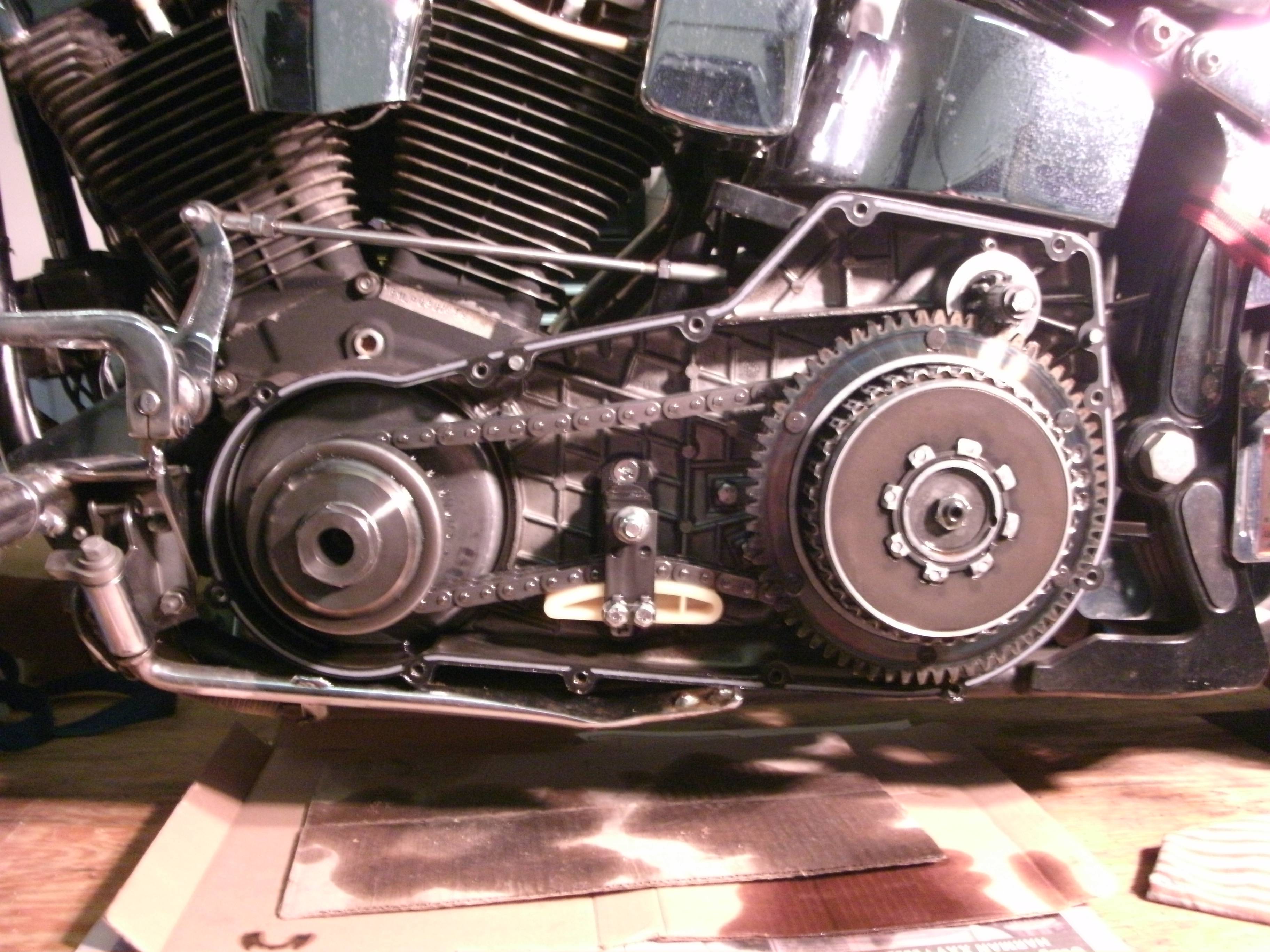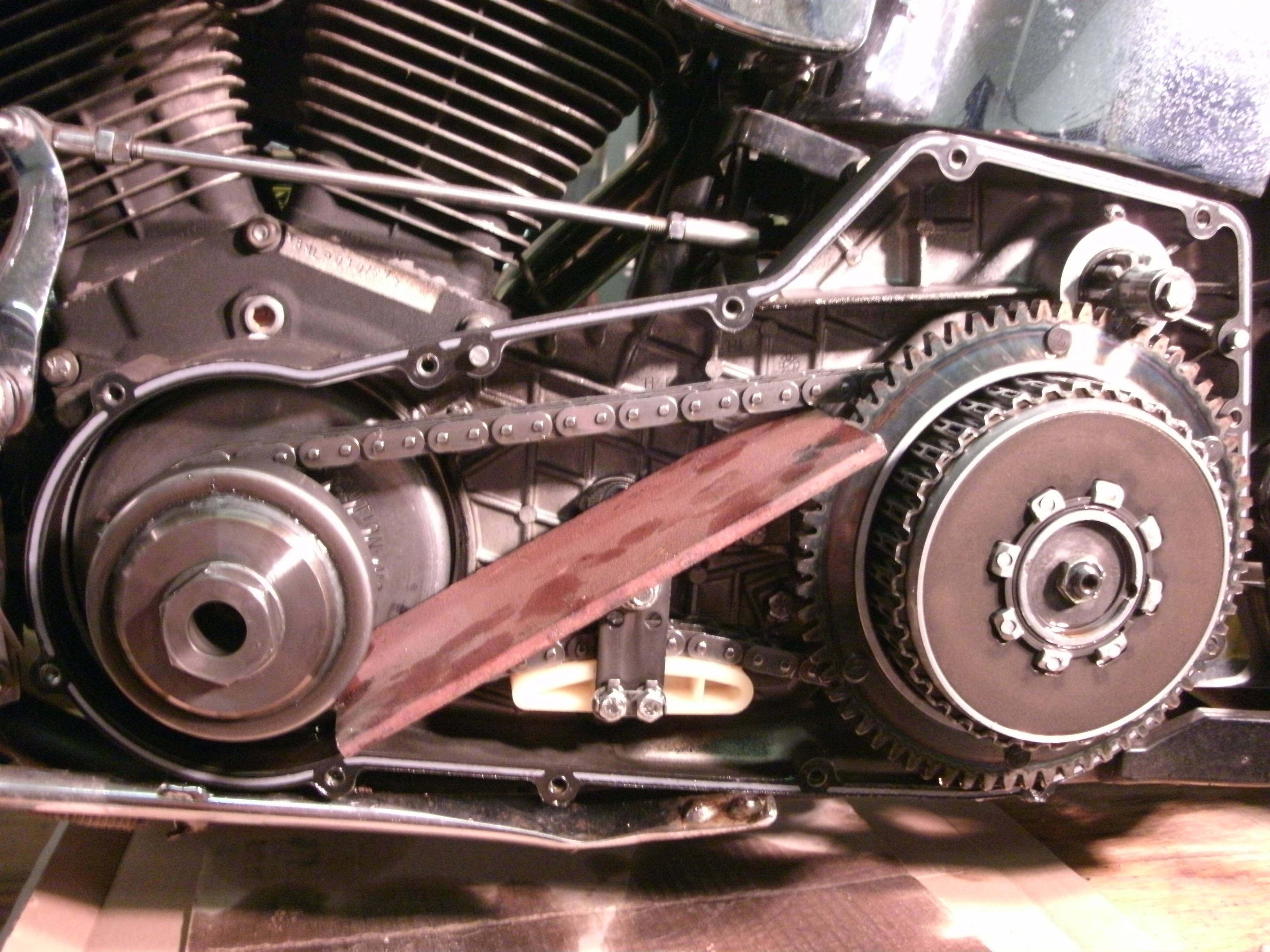 One of the things I like to do when I remove a primary, or a larger side cover on a metric bike that has many different-length fasteners, is to make up a little cardboard diagram and put the bolts where they go as I remove them, so reinstallation is easy.