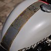 After studying photos of Tracy's body kits, Shah settled on a style and began sourcing parts to recreate the look. The Frankenstein mix of components he gathered included an FRP vintage teardrop tank from Goods in Japan, a basic aftermarket rear fender, and a set of side covers salvaged from his scrap parts bin. He then set to work merging the pieces by laying fiberglass directly over them, with the goal of creating a single, seamless structure. Once the general shape was established, he refined and finessed until he was completely satisfied with the result. For a suitably offbeat finish, the seat Shah built for the body was wrapped in dark green crocodile skin.