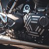 The rear of this Speed Twin's chassis is where the most dramatic structural changes took place. After cutting away the subframe, FCR welded a custom hoop in its place. The factory swingarm was given the flick, too, allowing the fitment of a billet machined alternative and the conversion to a monoshock setup. To shed some unsprung weight, FCR created one-off billet wheels and wrapped the rear in carbon covers. To then give the Speed Twin's parallel twin a unique look, they acid-etched the covers.