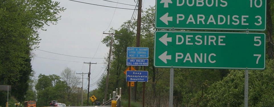 Ride the roads of America, or anywhere else, for that matter, and you'll eventually see some strange stuff along the way. Including the road signs themselves. Like the one above, for example. I'd always thought desire came before paradise, actually, and panic was another route entirely, but these signs set me straight.