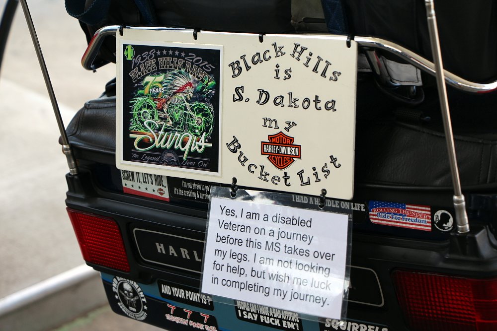 As I drew near, I noticed a plaque on the back of his bike. I couldn't read it, but we wound up riding together for maybe 50 miles or so. At some point, I drew close enough to read the placard, and I was pleased I had gotten a full tank of fuel right before I saw him. I could tell he was on a five-speed machine, and the ZLA Street Glide I was aboard is a six-speed, with a true overdrive. He'd burn through fuel faster than I would. That was good for me, because after I read the handmade sign, I knew I had to tail him until I could talk to him.
