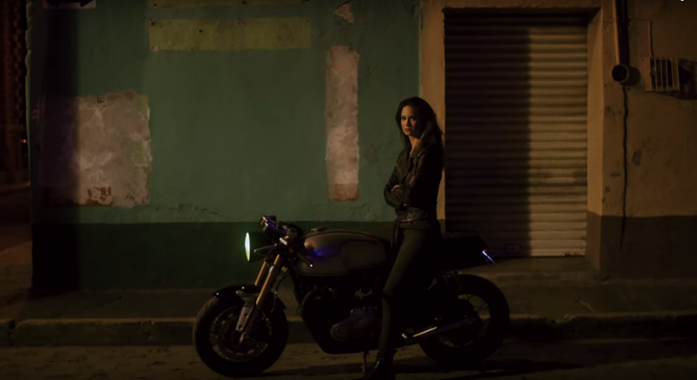In the Belstaff release, "Outlaws," the audience gets a pretty good look at the new Bonneville. Image from video.