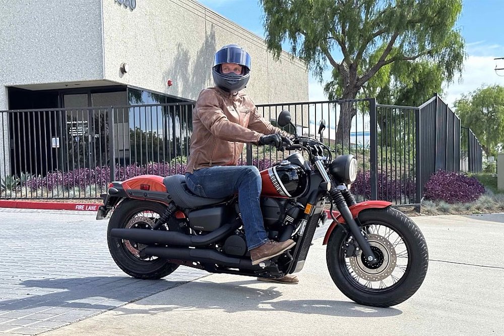 The Honda Shadow's seat is the lowest on this list (tied with the Indian Chieftain Dark Horse), but its forward controls increase legroom in the cockpit, as Zack demonstrates. RevZilla photo.