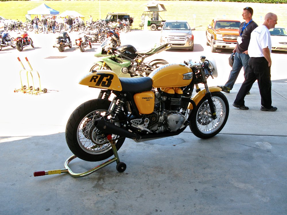 The heavily modified British Customs Thruxton on the right has a 21-inch front wheel and wide rear wheel. The bike looked great. The handling was another story. Photo by Spurgeon Dunbar.