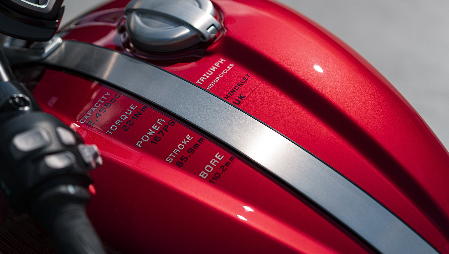 The first — and most unexpected — of the specials is the “221 Edition” for the Rocket 3 R and Rocket 3 GT. This package is “designed to celebrate the Rocket 3’s category-defining performance, including its world-leading 221 Newton meters (163 foot-pounds) of peak torque… available for one year only.” Triumph actually prints the bike’s power, torque, displacement, bore and stroke on the tank so owners can proudly rattle off the specs of the world’s largest production motorcycle. (See image above.) In the United States, owners may also need to explain what measurements in PferdStarke and Newton-meters mean, exactly.