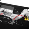 The camera system utilizes infrared flash, high shutter speeds, and filters to determine whether a driver is using a mobile phone. It also detects if a driver isn't wearing a seatbelt. Acusensus photo.