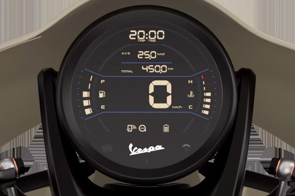 The circular dash offers classic form and modern function with its reverse LCD screen. Vespa photo.