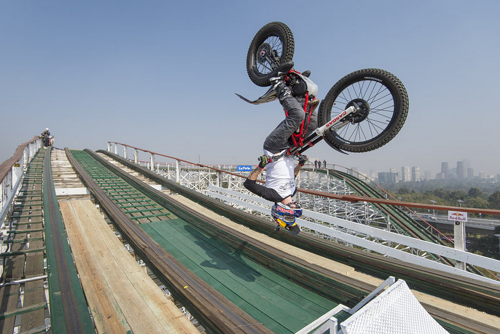 Meet French trials legend Julien Dupont. He's really, really good at stuff. One of the things he's good at is doing maneuvers on a motorcycle (or, more specifically a trials bike) that just shouldn't really be possible. Together with Red Bull, he decided to show you some of those things on the Montaña Rusa, a wooden roller coaster at the La Feria de Chapultepec amusement park in Mexico City that is famous for being the tallest wooden roller coaster in the country.