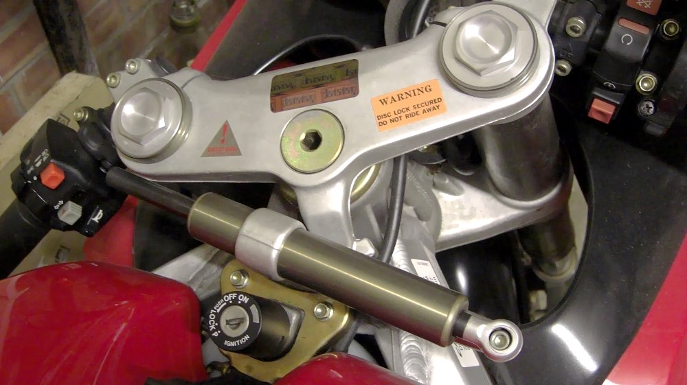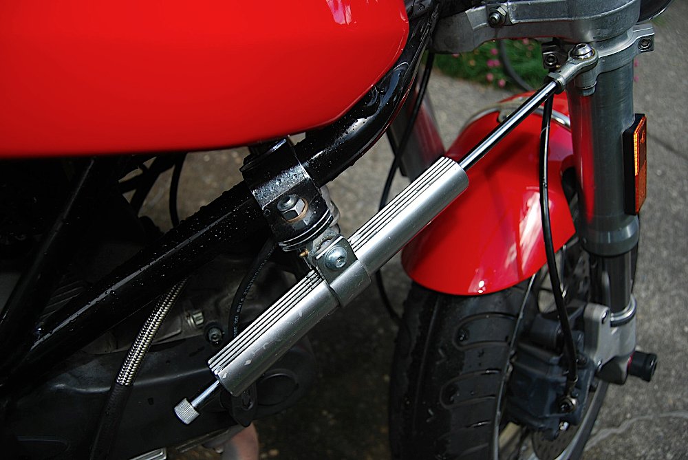 Early steering stabilizers used stacks of friction discs, but hydraulic systems are the standard today. Hydraulic stabilizers use two main construction types: linear and rotary. Linear stabilizers slide a piston through oil, similar to what you might see under an off-road truck or Jeep. Rotary stabilizers sit on top of your steering stem, and force oil through small passages inside the unit. Some stabilizers are adjustable, usually with a small knob. Still others have electronic components that vary resistance, usually in relation to speed. The faster you go, the more it ramps up the resistance. Non-adjustable stabilizers can still be “adjusted” by changing the fluid inside to a different weight. Do some research on your model before attempting this.