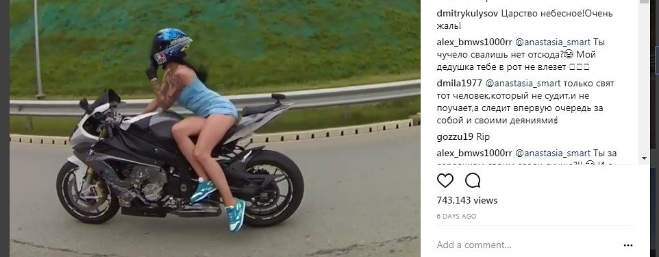 Of course there are plenty of attractive women using social media to gain a bit of fame that they never could have had in earlier times. Pronina just mixed the usual recipe of racy outfits and poses with a fast motorcycle and some mild stunts. Some said she died doing what she loved, and that's not the worst thing that can happen to you. Others said that she left her daughter a poor legacy: being an orphan, with provocative videos to remember her mother by.
