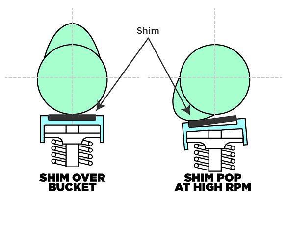 There's a potential problem with shim-over-bucket adjusters in high-performance engines, however. There are times when an engine can spin so fast that the valve spring cannot snap the valve closed before the cam attempts to open it again. Effectively, for a split second, no load is placed upon the valve by the spring. (The phenomenon is known as valve float.) That lack of spring pressure, coupled with the rotational “wiping” action of the cam lobe, can actually “shoot” a shim out of its captive spot on top of the bucket, eliminating clearance entirely! See the illustration above.