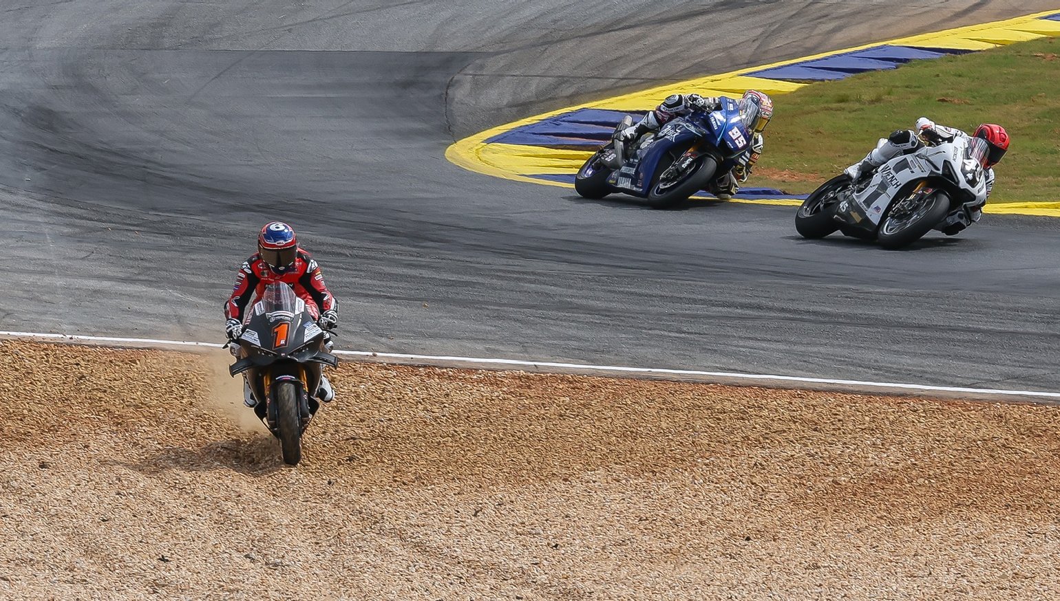 Up front, Strack Racing's Mathew Scholtz got his second perfect start and pulled away from the field, while Beaubier worked his way through the pack again. Only those two were able to lap in the 1:24 range, and despite running off track once at the end of Road Atlanta's long back straight when headshake caused his Ducati to lose its brakes temporarily (see the photo at top), Beaubier relentlessly moved up to third for an unlikely podium finish.
