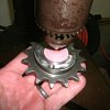 After 20 minutes of alternating between my milk crate at the side of the bike and standing in front of the drill press, I had a sprocket that would slide on and just barely allow the sprocket retainer to slip on and rotate into position. The freshly machined section got some clean-up work with a bit of emery cloth to knock down any errant burrs. I then gave it a good dunk in the "poor-boy parts washer." (That's one of Mrs. Lemmy's old pots filled with kerosene and one of Lemmy Junior's old toothbrushes.) After cleaning the metal and abrasive particles off carefully, I gave the shaft splines a coat of grease, and then I installed it. After bolting the retainer into place, the sprocket was locked in firmly enough to feel like it was welded.