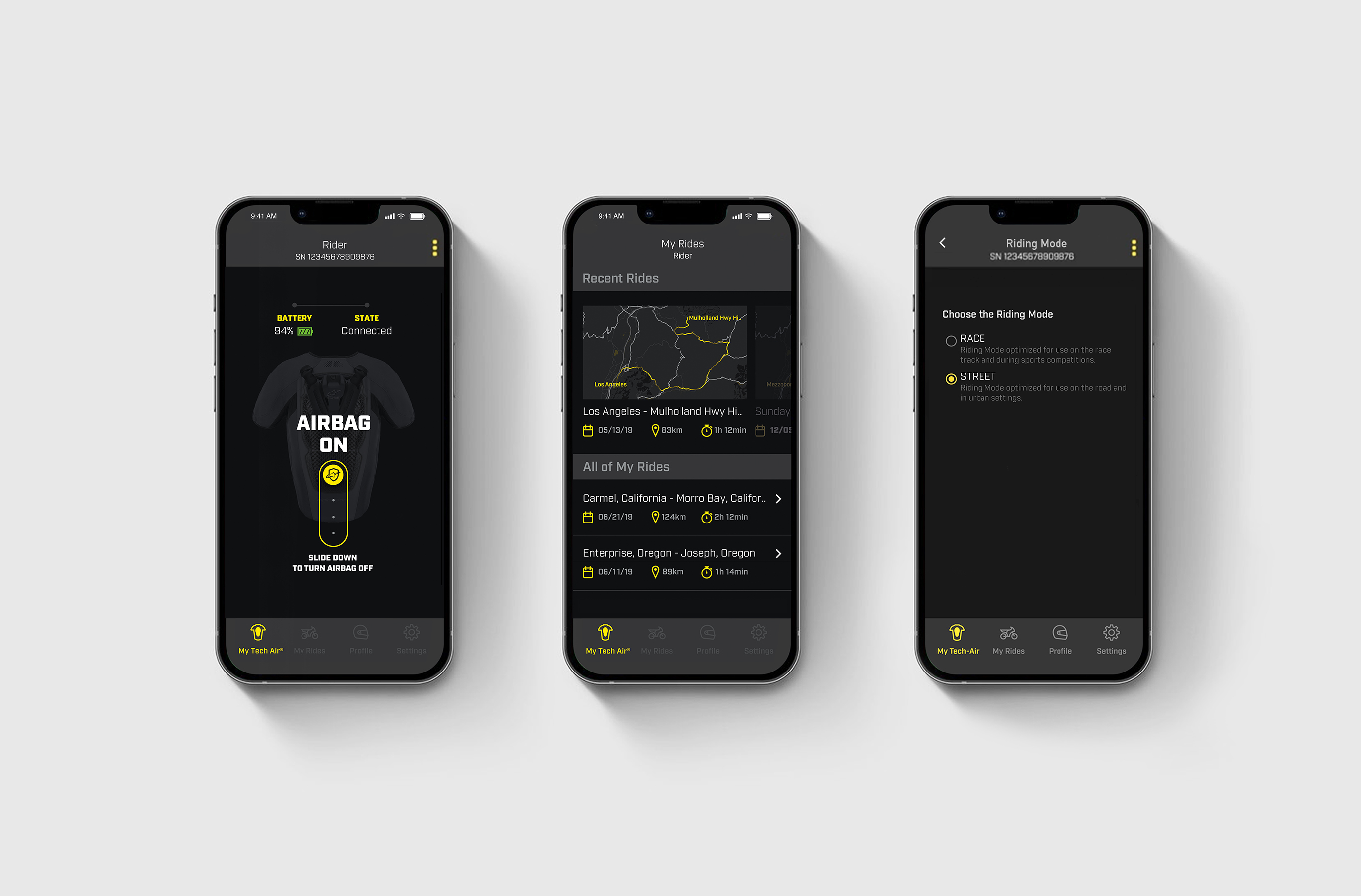 The Tech-Air App pairs via Bluetooth to the vest. The app displays the vest’s operational status, remaining battery life and provides a detailed analysis of your ride. Over-the-air firmware updates are also handled through the app.
