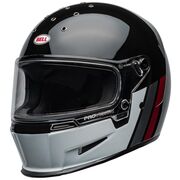 The Bell Eliminator is a stripped down, yet bold, full-face helmet with street cred. Constructed with a fiberglass composite shell, the Eliminator boasts the ProVision dual pane, anti-fog face shield with Class 1 optics. The anti-bacterial liner and contoured cheek pads are comfortable. Take off the face shield and put on the optional peak for use with your own pair of goggles.