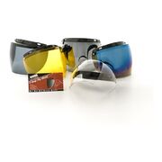 Universal fit flip up face shield for retro-styled open face helmets with three snaps above the brow.