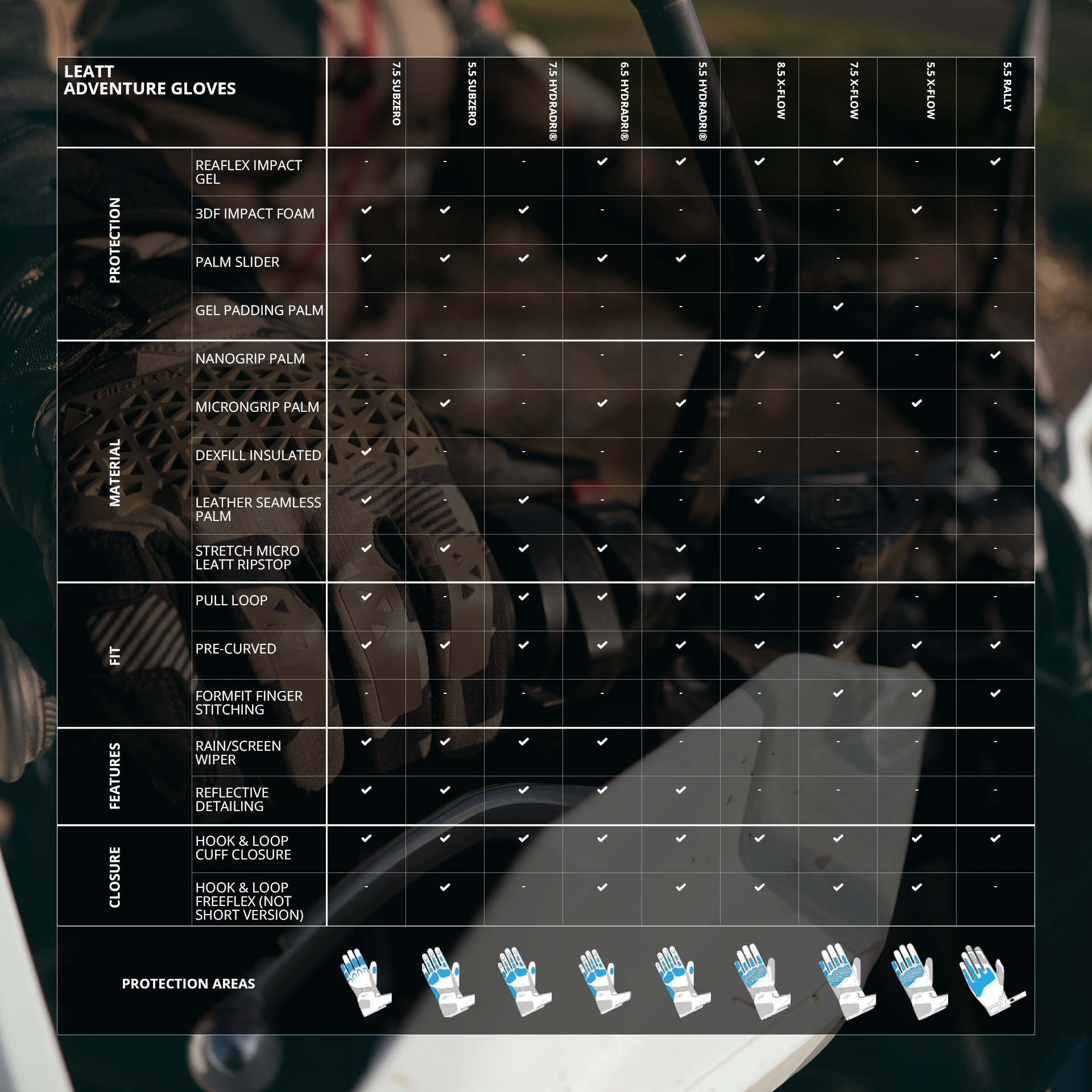 The Leatt ADV Rally 5.5 gloves are engineered to deliver unparalleled protection and innovation for adventurers on two wheels. They boast cutting-edge 3D molded ReaFlex impact gel for knuckles and fingers, alongside an injection-molded wrist protector that safeguard hands while preserving flexibility and movement. Riders can appreciate the gloves' continuous airflow ventilation, which ensures cool comfort on the trail. The revolutionary NanoGrip palm technology offers superior feel and steadfast grip, regardless of weather conditions. Designed with a pre-curved fit, seamless palm and memory foam padding, these gloves maintain comfort and control on even the most challenging rides.