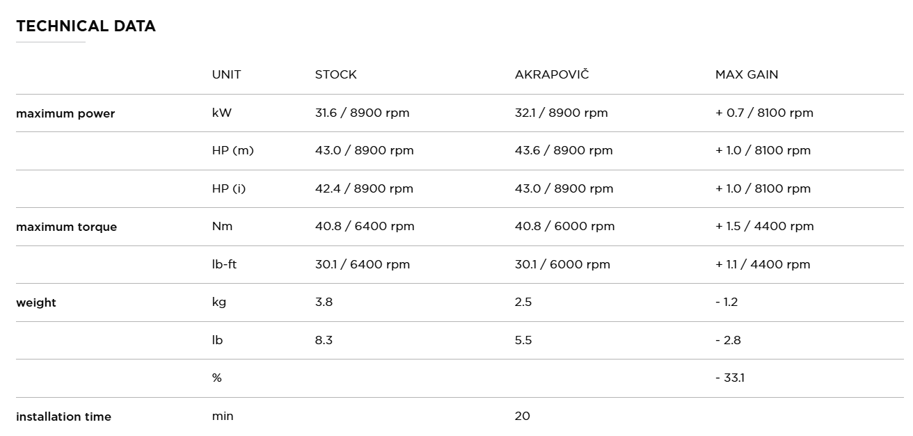 It’s not just about peak power—Akrapovic exhaust systems deliver increased performance throughout the entire rpm range. Increased power and torque result in a much smoother ride. All Akrapovic exhaust system's performance are measured and tested on their in-house computer-controlled chassis dynamometers.