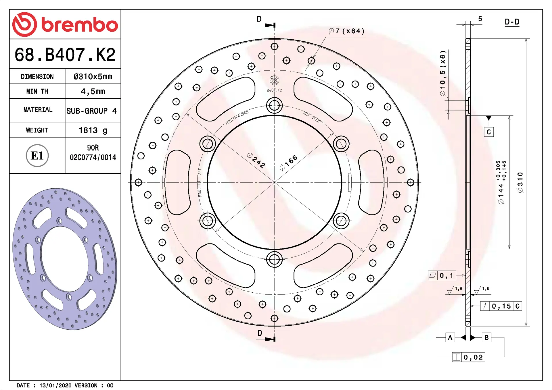 Brembo Serie Oro Fixed Front Brake Disc 68B407K2 Schematic