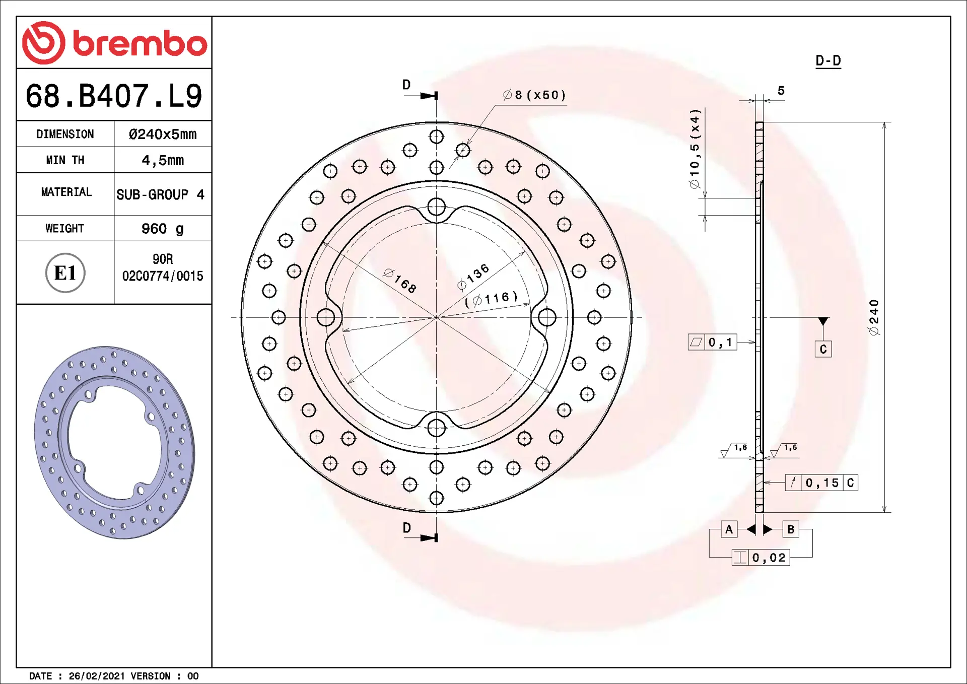 Brembo Serie Oro Fixed Rear Brake Disc 68B407L9 Schematic