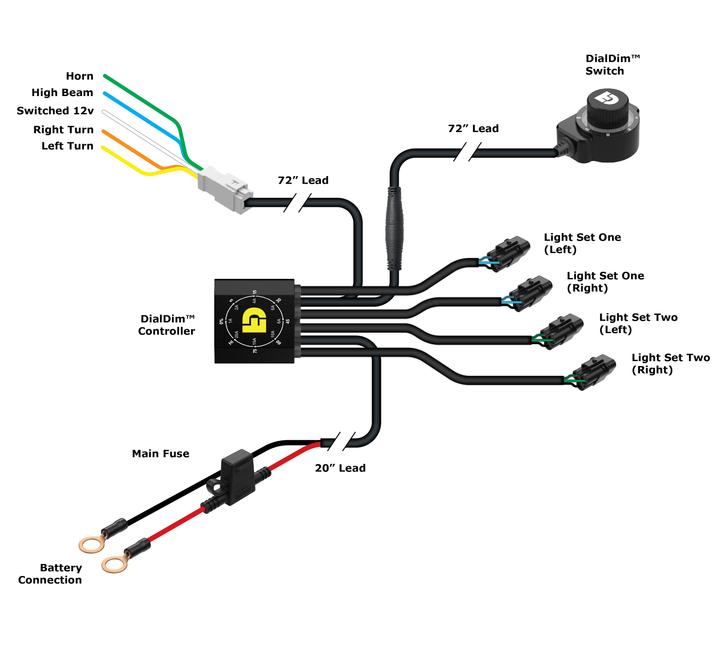 Get ultimate control of the lighting on your bike, UTV or ATV for the optimal safety and visibility with the Denali DialDim Lighting Controller. The DialDim Lighting Controller features a multicolor halo dimming switch that allows you to independently turn on/off and dim two sets of auxiliary lights from a single consolidated wiring harness. The LED halo switch displays your exact settings and allows for effortless dimming on the fly. The controller also features high beam, turn signal, and horn inputs to unlock intelligent flash features that can cancel your aux lights with your turn signal, flash your aux lights as a turn signal, or strobe your lights when you sound your horn.