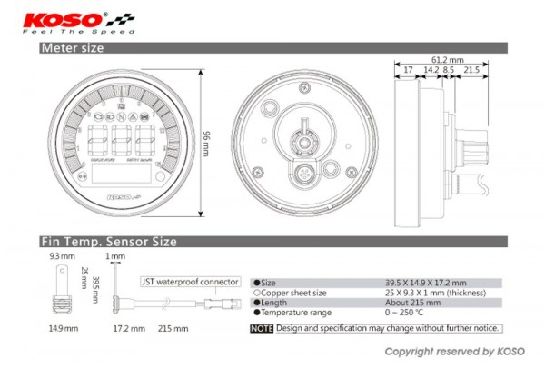 - Displays speed (0-225 mph or 0-360 km/h), temperature (14-140*F or -10-60*C), low/high voltage warnings, etc