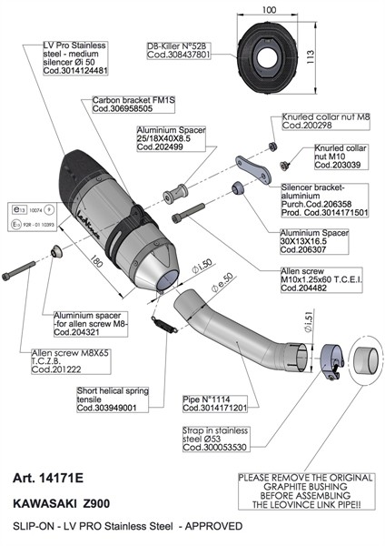 The Leo Vince LV Pro Slip-On is the ideal combination of aggressive sound, power and style for the most demanding riders. The stainless steel inlet is attached to the muffler body with TIG welding. The end cap, a real novelty of this exhaust, is made entirely of carbon fiber and has an asymmetric and aggressive cut. The muffler clamp is also made entirely of carbon, combining to create a perfect balance of aesthetic excellence.