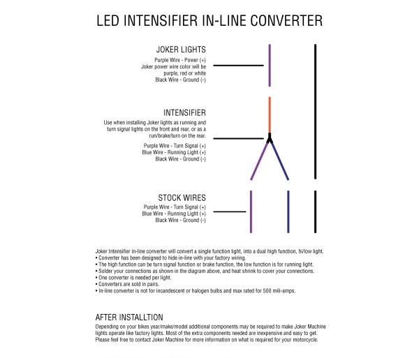Converts single-function LED bulbs into high-low dual-function bulbs; run-stop, run-turn or high-low. Includes hard-wired pair of two-function intensifiers with a universal LED fitment with a maximum of 500-milliamps.